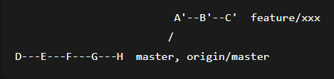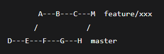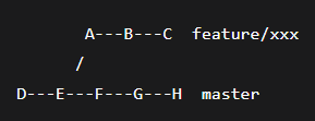 Вы отпочковались от коммита E. В master ушли коммиты F, G, H (другие фичи или исправления). Если вы просто выполните git merge master в feature/xxx, получите merge-коммит: